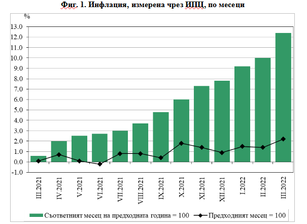 Годишната инфлация за март 2022 година по отношение на март 2021 година е 12.4%, регистрират от Националния статистически институт.