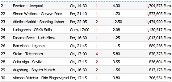 На 30-то място със над 706 хиляди евро е единицата на Витоша (Бистрица) - Пирин, а междинният коефициент е 3.8. Равенството сред двата тима е на 41-во място, а играната сума е над 363 хиляди евро.