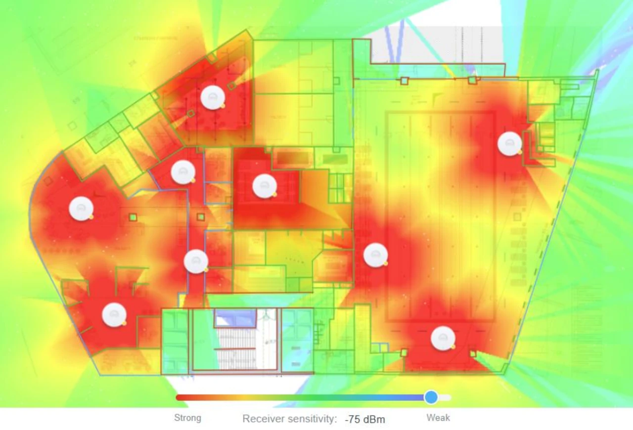 Преди построяването на мрежа за бизнеса се прави планиране, при което се пресмятат въздействията на стени, железни структури и други обекти в обсега на мрежата; прави се и “карта ” на покритието (графика: TP-Link)