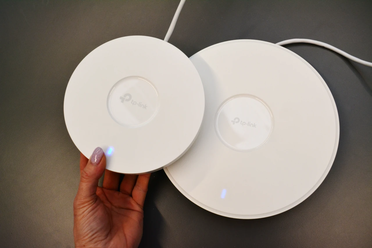 Кръгли и със обикновен дизайн, точките за мрежов достъп на TP-Link са планувани за таванен монтаж и успешно се сливат с съвсем всеки интериорен дизайн (снимка: Мария Малцева / TechNews.bg)