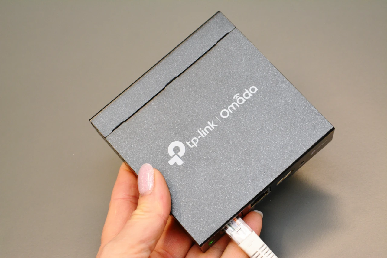 Хардуерният SDN контролер Omada модел OC200 може да ръководи 130 мрежови устройства. Освен два мрежови врата RJ45 той има и USB порт, който може да се употребява даже за зареждане с интернет през мобилен телефон при положение на потребност (снимка: Мария Малцева / TechNews.bg)