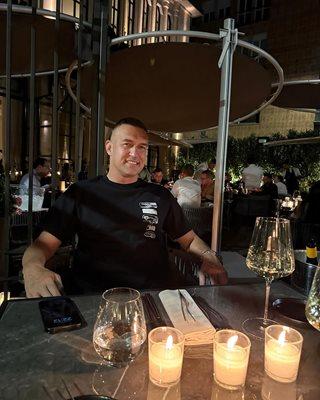 Облечена в черна рокля, именячката сияе до някогашния футболист, който е заложил на дънки и дънково яке. Вечер нападателят пък си пийва изстудено бяло винце и очевидно е в ужасно въодушевление.