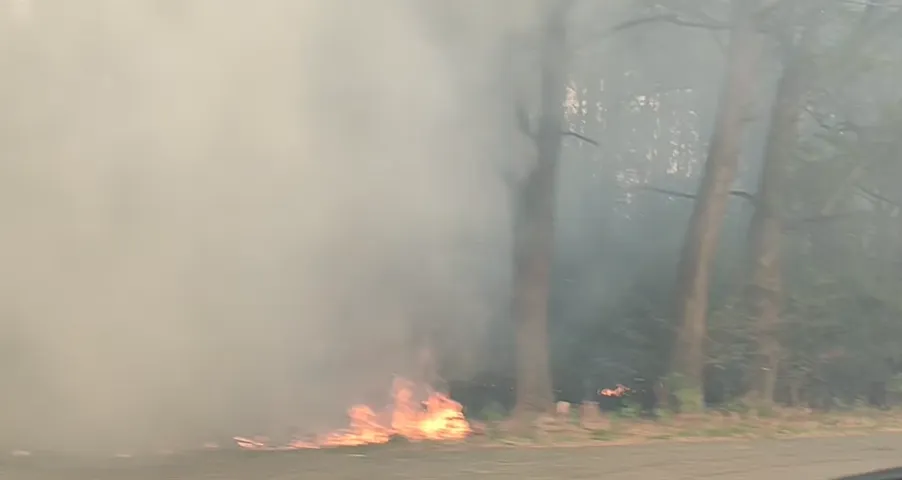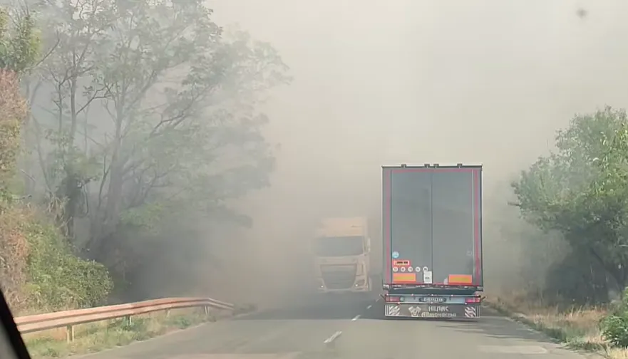 На фрагменти, публикувани от очевидци в обществената мрежа Фейсбук, се вижда по какъв начин сухи треви и шубраци горят директно до шосето.