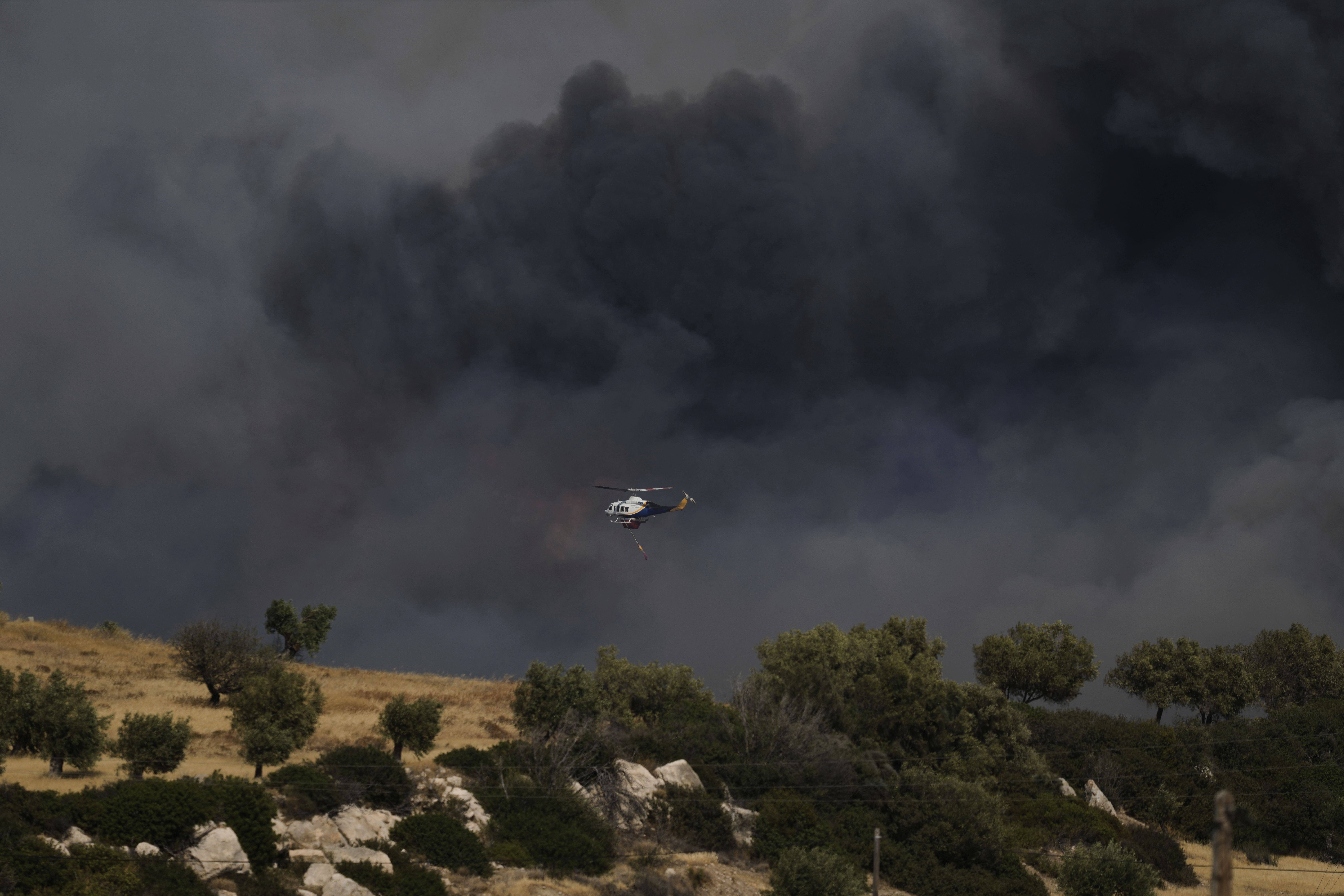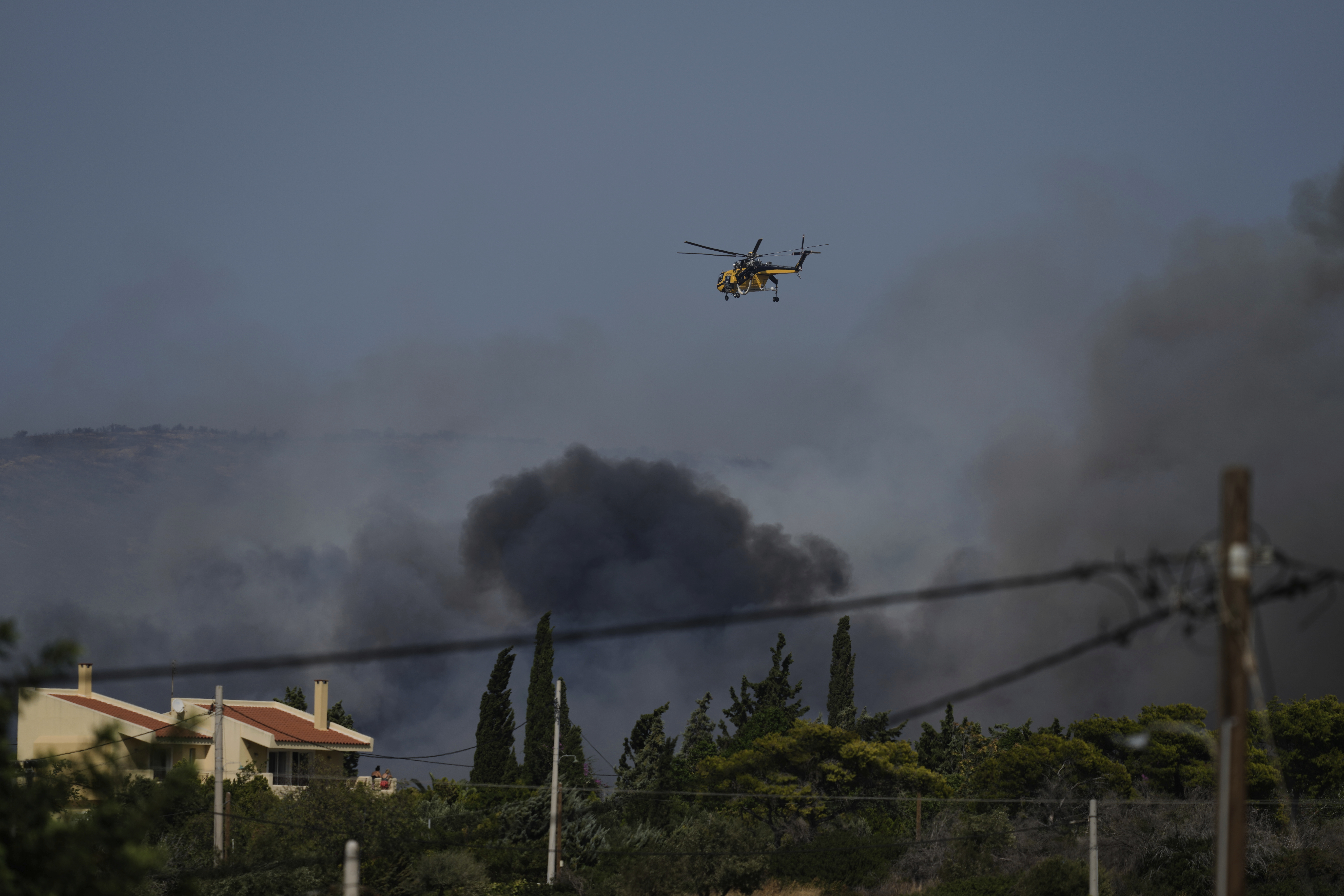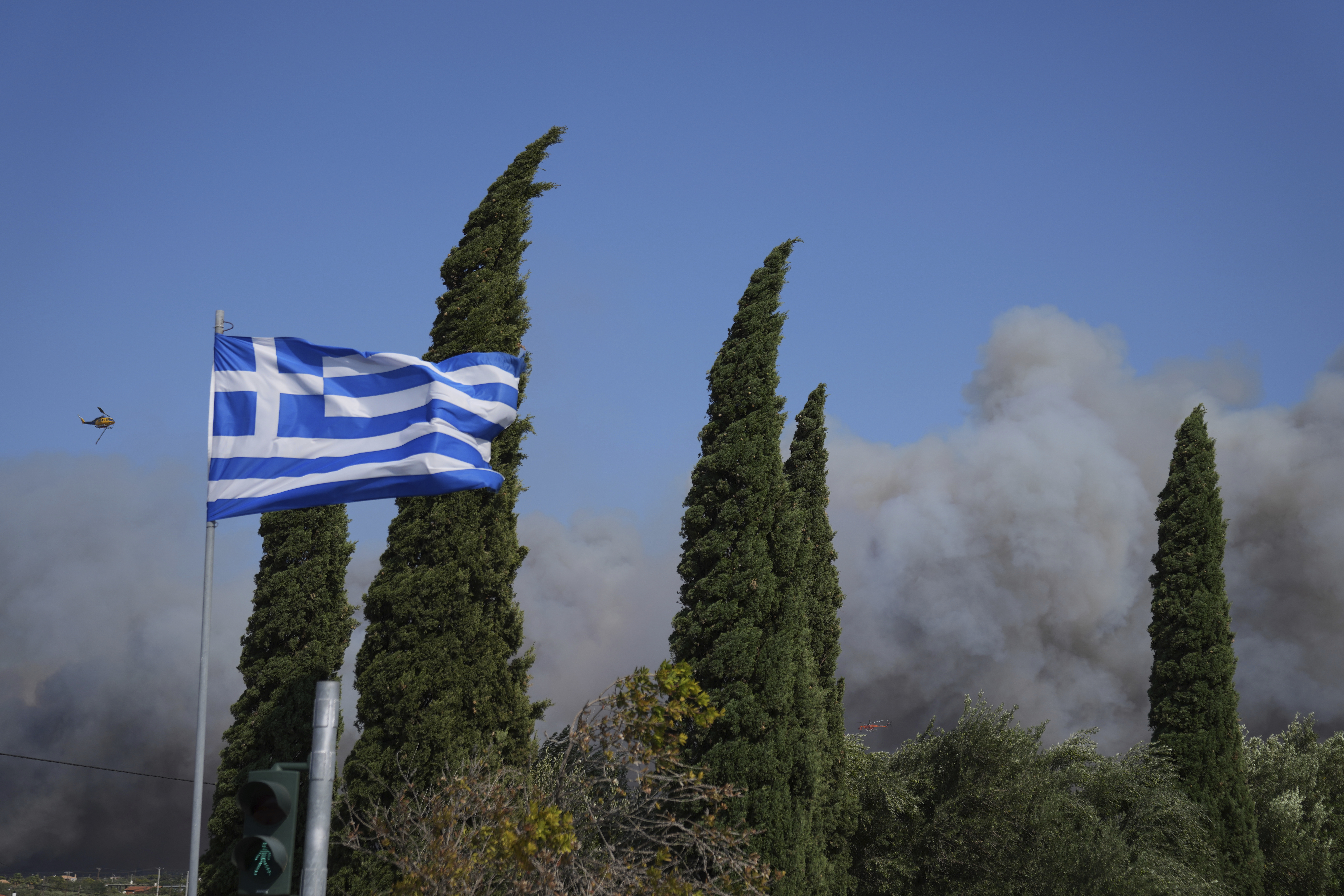Силният вятър усложнява обстановката, а в област Атика е в действие червен код за заплаха от пожари.