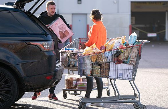 На фрагментите, обиколили интернет, се вижда по какъв начин британският национал е препълнил две пазарски колички с всевъзможна храна и питиета.