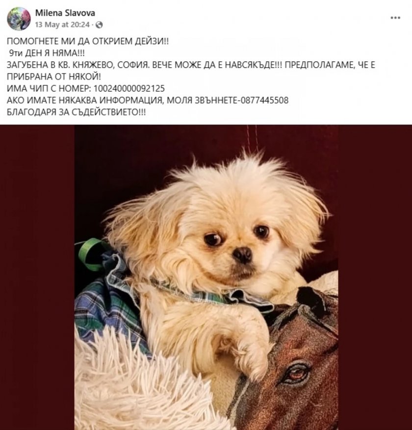 Изпълнителката е прецизирала, че предлага заплащане и насочва молба поста ѝ да бъде популяризиран, с цел да може по-бързо да се откри кученцето.
