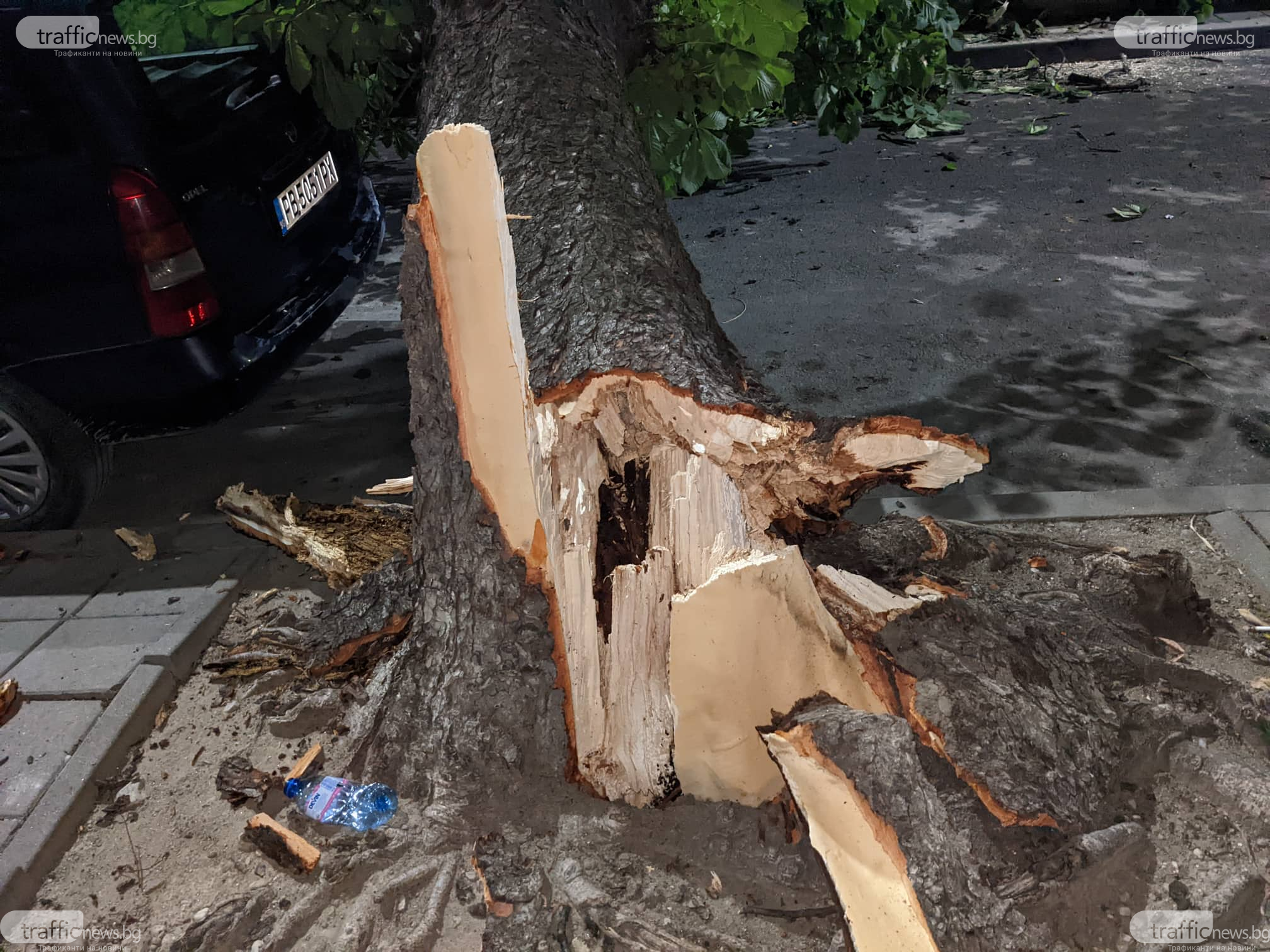 По първична информация няма потърпевши и нанесени материални вреди. Дървото е паднало на по-малко от метър от паркиран лек автомобил.