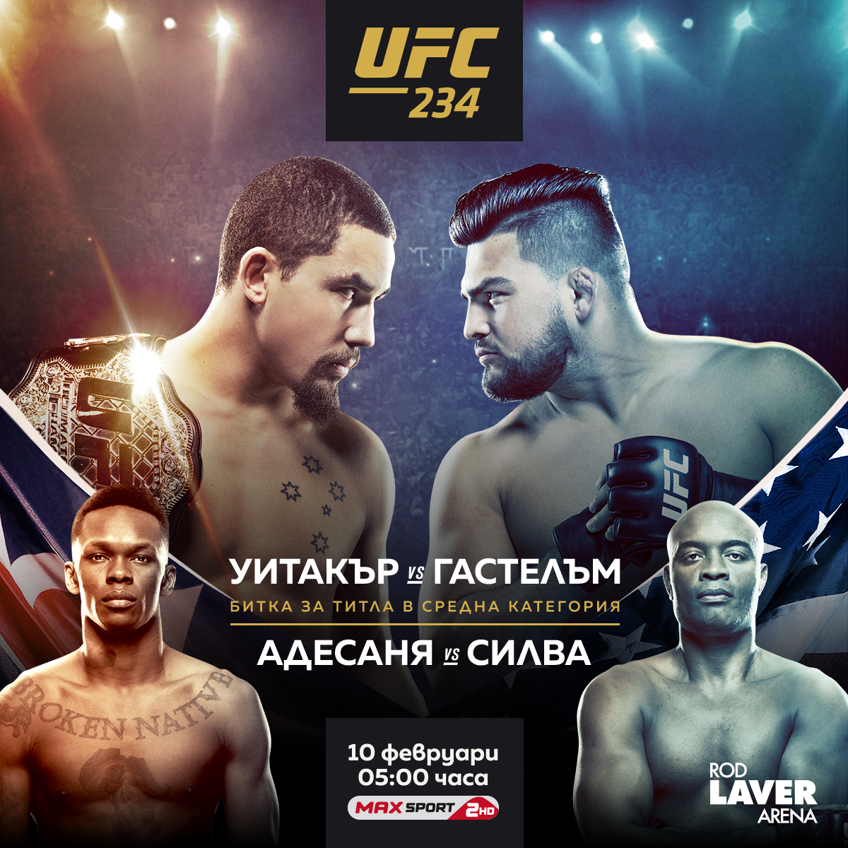 Най-престижната организация за свободни боеве – UFC, също е подготвила ужасно шоу през уикенда за всички ММА почитатели. Австралиецът Робърт Уитакър взе купата в междинна категория през 2017 година, след победа над Йоел Ромеро и в този момент ще я пази пред лична аудитория в Австралия против американеца Кевин Гастелъм.