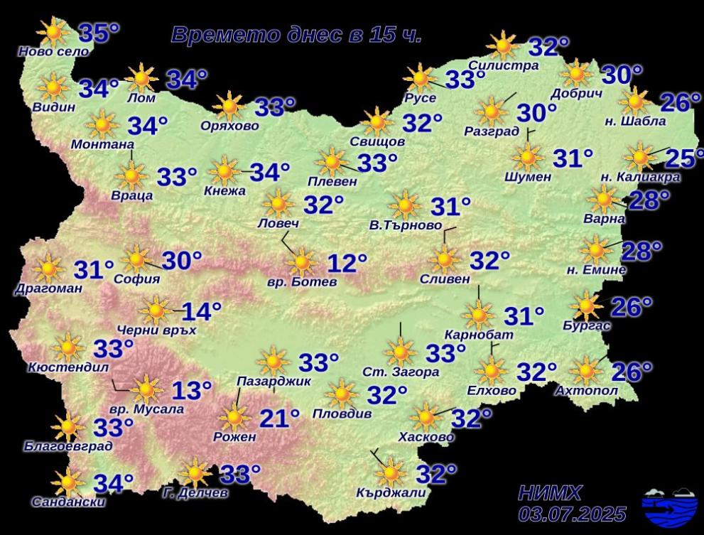 Национален институт по метеорология и хидрология Най-топло е в Северозападна България и на Югозапад . В Ново село са измерени 35 градуса в 15:00 часа, в Лом, Видин, Монтана и Кнежа живакът демонстрира 34 градуса.