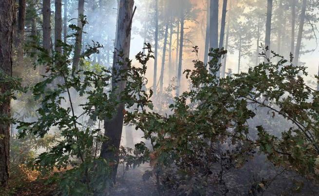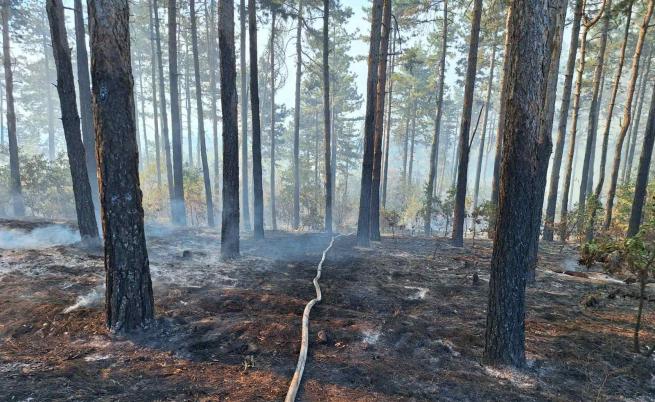 Гори борова гора край с. Баховица. Пожарът е навлязъл от прилежащи аграрни територии.