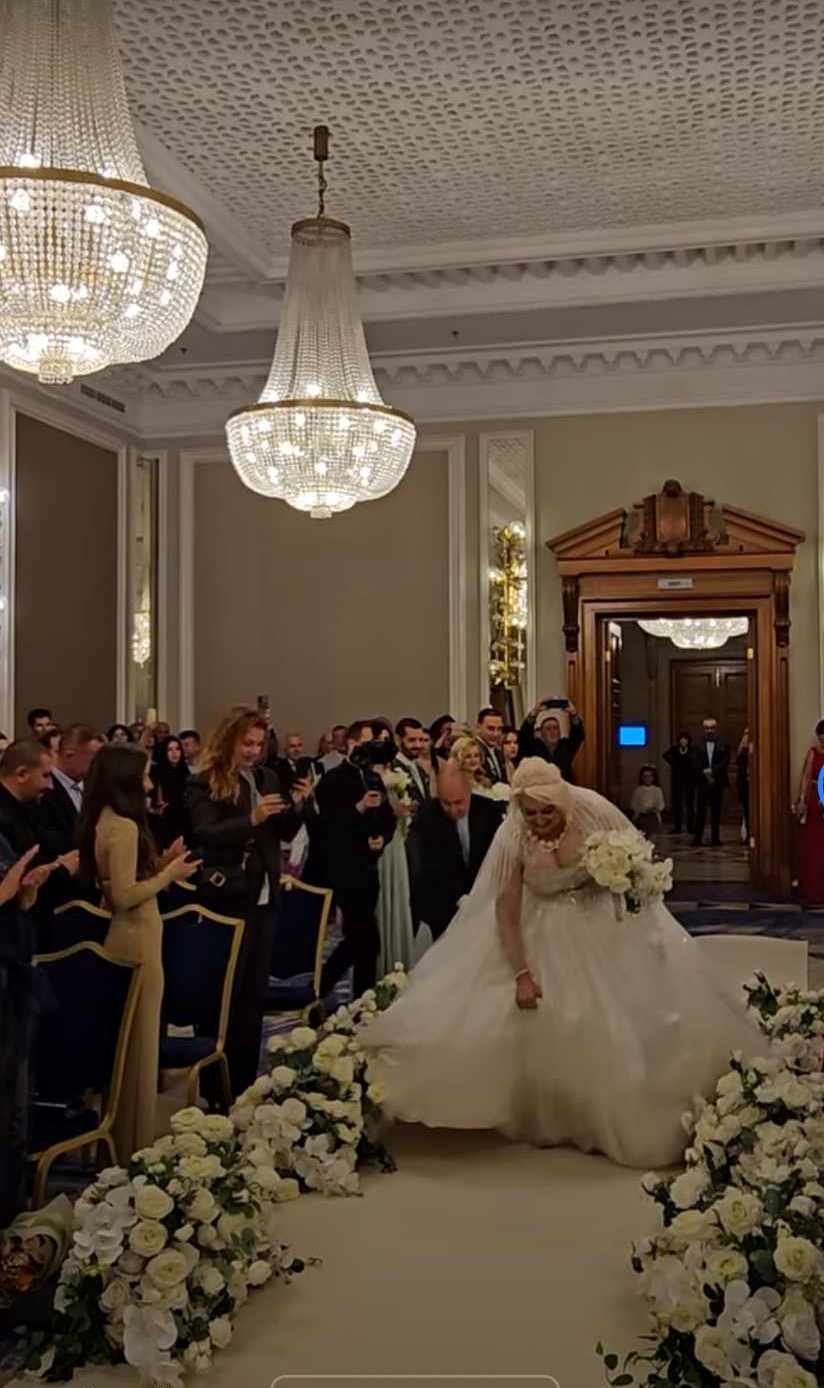 Истинският проблем настава, когато булката доближава павилион от хиляди бели цветя, подреден в ресторанта, пред който я чака младоженецът дружно с кумовете и водещата на събитието. Звездата на вечерта – младоженката, се пробва да се качи при тях, само че това се оказва съвсем непостижима задача, тъй като роклята, като се изключи че е с голяма пола, е и с голям шлейф, който стартира да се оплита към краката на „ най-красивата младоженка “. „ Тази красива рокля... “, чуди се по какъв начин да излезе от неуместното състояние Деси Банова. В това време една от шаферките идва на помощ, събира шлейфа и умело го мята в павилиона, все едно играе волейбол. Това придвижване освобождава булката и церемонията най-сетне стартира. Между другото, внушителната рокля е дело на една от най-награждаваните и скъпи родни модистки. Много от наблюдаващите сватбата през обществените мрежи са на мнение, че с творбата си тя може да кандидатства за „ антиприз “ за най-кичозна дреха.