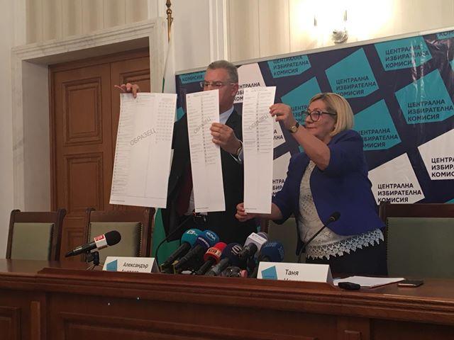 Говорителите на ЦИК Александър Андреев и Таня Цанева демонстрираха мостри на бюлетините за гласоподаване в изборите за общински съветници, кметове на общини и районни кметове, планувани на 27 октомври 2019 година