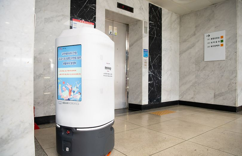 За разлика от други роботи, които нормално могат да употребяват единствено един етаж, роботът на градския съвет на Гуми можеше да извика асансьор и да се качва по етажите самичък.