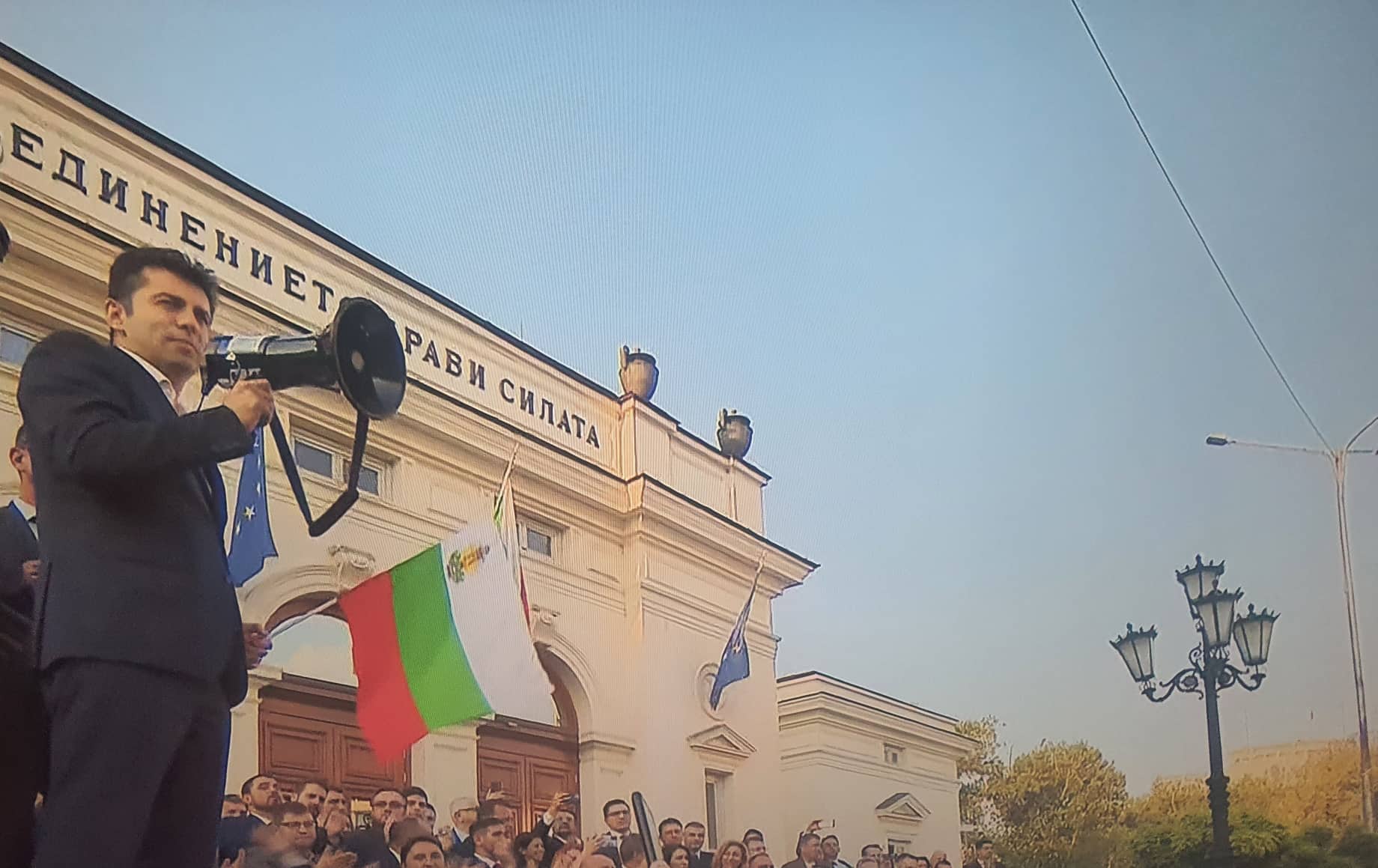 Кирил Петков, Асен Василев и Никола Минчев излязоха при протестиращите пред парламента