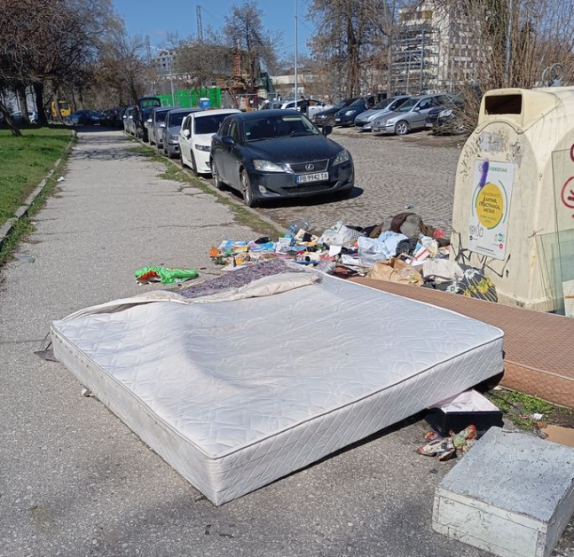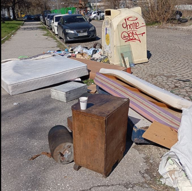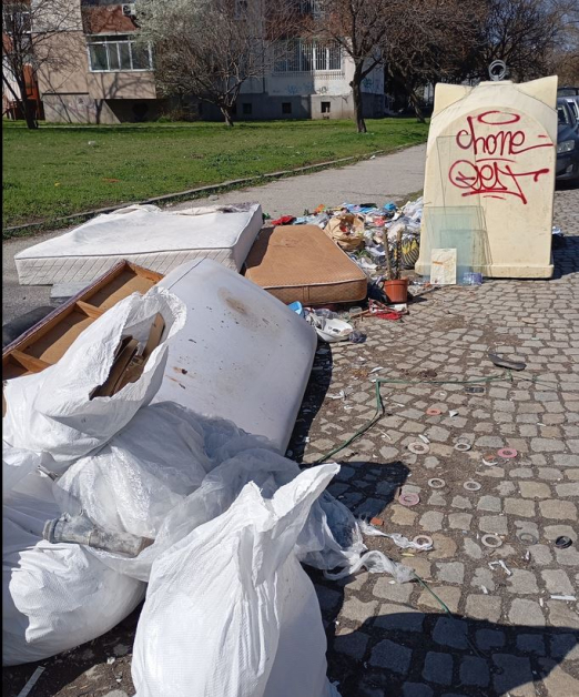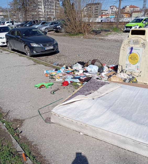 Тя илюстрира сигнала си и със фотоси - стари матраци, мебели, торби със строителни боклуци, пластмаси и всевъзможни други отпадъци се виждат край казаните за разделно събиране на боклуци.