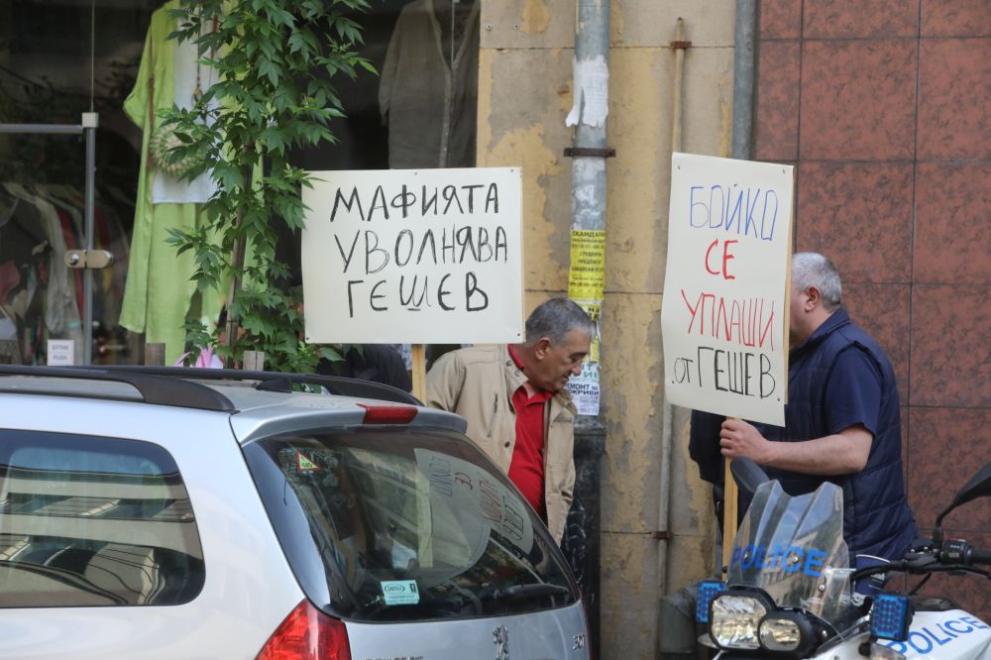 Протестиращите държат табели с надпис “Мафията уволнява Гешев ”, “Бойко се уплаши от Гешев ”.
