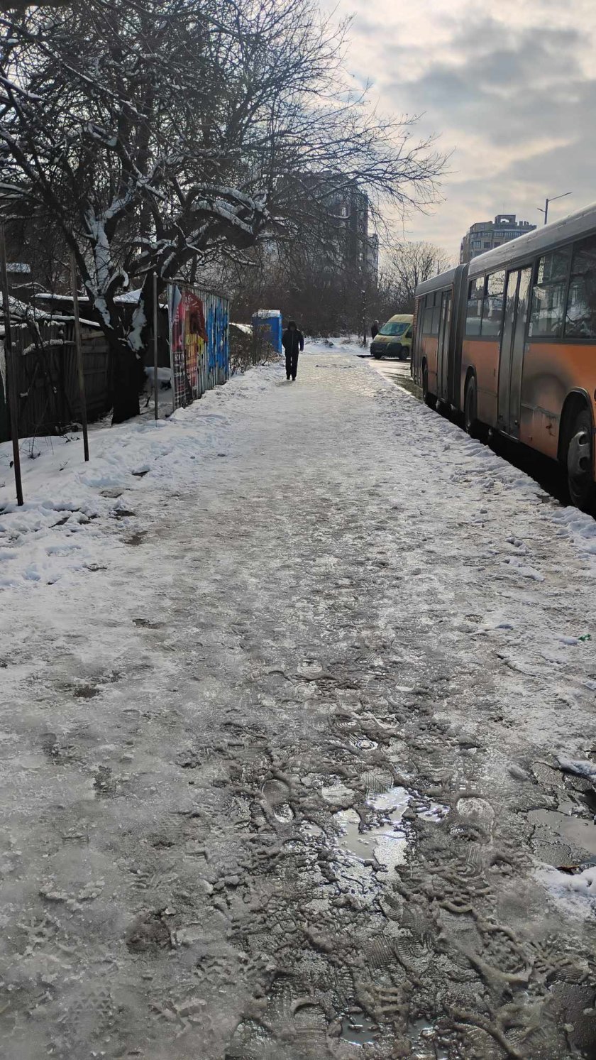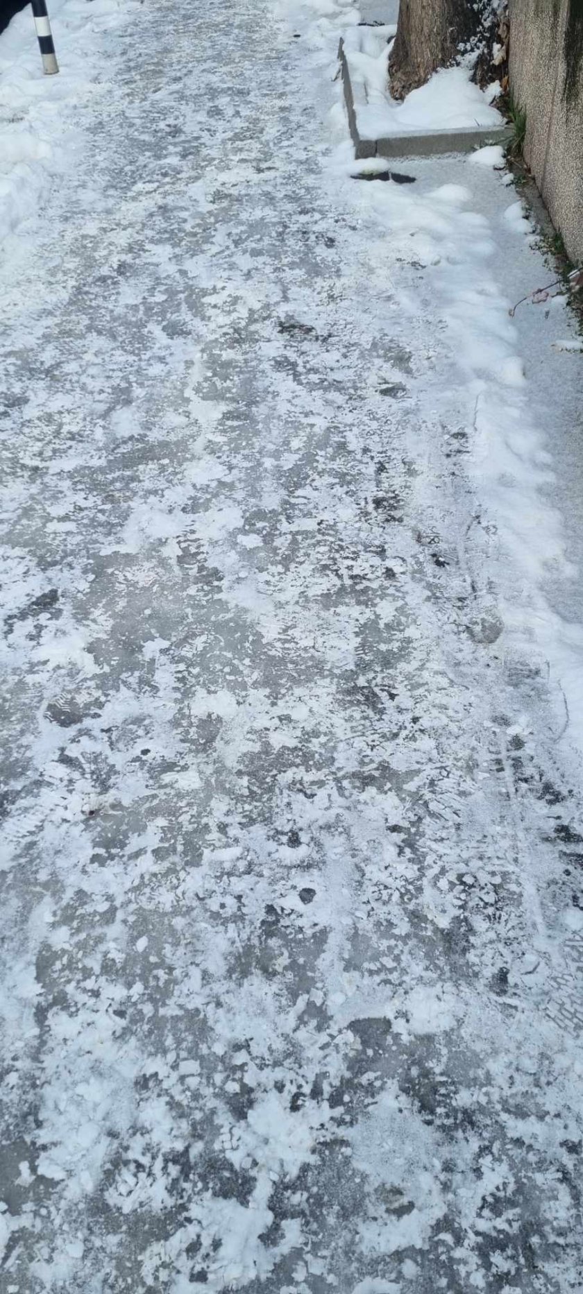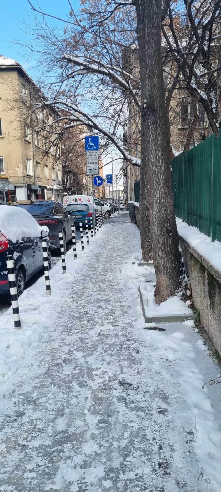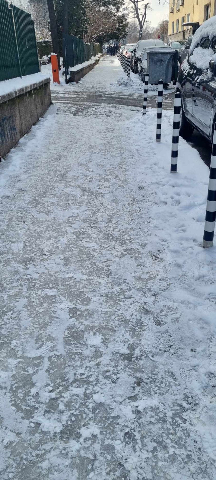 След изобилния снеговалеж в понеделник в София натрупа забележителна снежна завивка. Жители на града изпратиха фотоси със сигнал за непочистени региони. Те се оплакват, че тротоарите се трансформират в пързалки и са рискови.