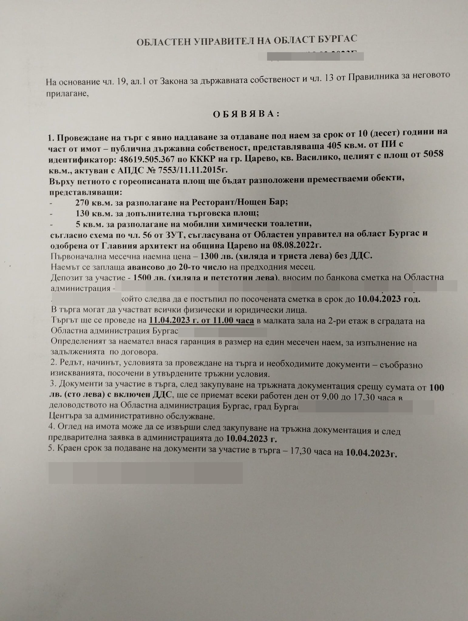 Местен човек е декларирал капиталово желание пред Областната администрация на Област Бургас, в резултат на което е проведен търг , който би трябвало да се организира на 11 април тази година. Той е за отдаване чартърен за период от 10 години на 405 квадратни метра от ПИ 48619.505.367 по КККР на град Царево. Този терен се явява част от скалите пред квартал „ Василико “, изясни Скулиев. И е ситуиран в непосредствена непосредственост до плаж „ Нестинарка “.