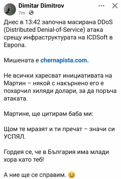 „ Посещенията на платформата доближиха рекордни стойности. Явно съм засегнал и избрани ползи, тъй като се вършат опити уеб сайтът да бъде свален “, написа в профила си във Фейсбук младият основател на плана.