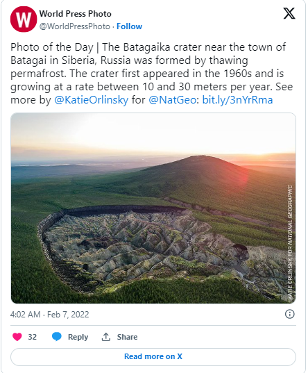 Ново изследване разкри, че размерът на кратера Батагайка в Сибир се е нараснал с обезпокоително бързи темпове. Батагайка беше открит през 1991 година, откакто сателитни фотоси разкрили мегасреда с форма на попова лъжичка, оповестява The Sun. Местните поданици в отдалечения регион на Якутия считат грандиозния кратер за религиозен и го назовават „ врата към подземния свят “.