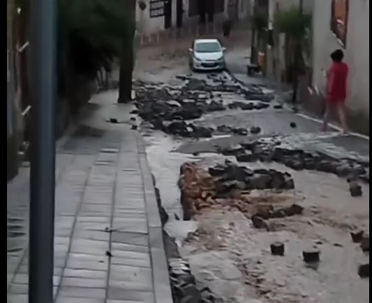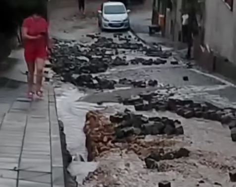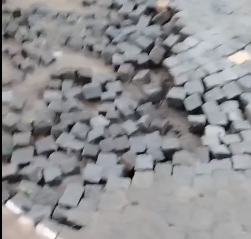 Граждани настояват, че павирана улица безусловно е помляна от силата на бурята. Каменните блокчета са изкъртени от водата и се валят далеко от местата си, демонстрират фрагменти. Няма информация коя е въпросната улица.