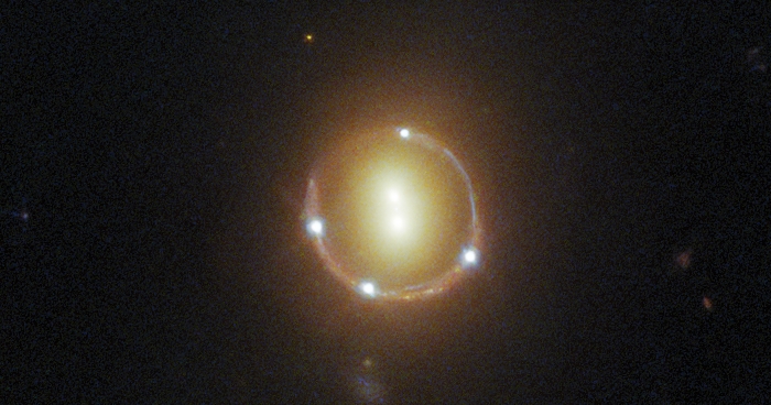 Това е така наречен пръстен на Айнщайн и тези ярки точки не съставляват шест галактики, а три – две в средата на пръстена и един квазар зад него. Светлината на квазара се изкривява и усилва, до момента в който минава през гравитационното поле на двете галактики на напред във времето.