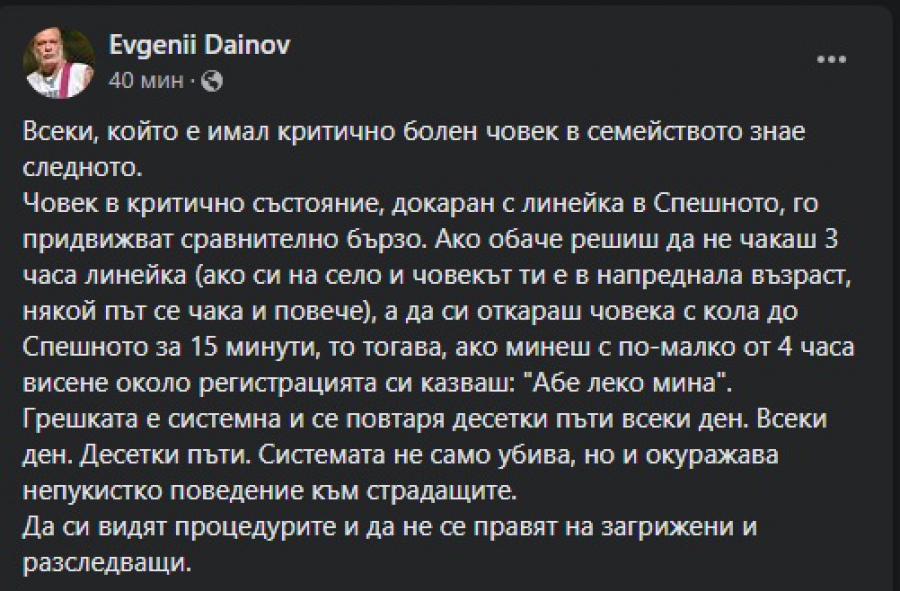 " Всеки, който е имал сериозно болен човек в фамилията знае следното. Човек в сериозно положение, докаран с кола за спешна помощ в Спешното, го придвижват относително бързо. Ако обаче решиш да не чакаш 3 часа кола за спешна помощ (ако си на село и индивидът ти е в преклонна възраст, някой път се чака и повече), а да си откараш индивида с кола до Спешното за 15 минути, то тогава, в случай че минеш с по-малко от 4 часа висене към регистрацията си казваш: " Абе леко мина ", написа още политологът.