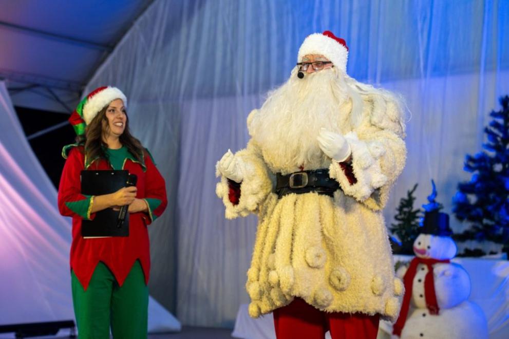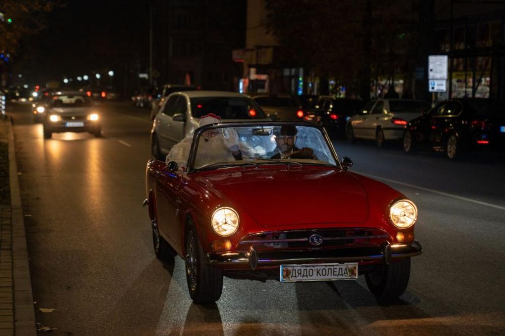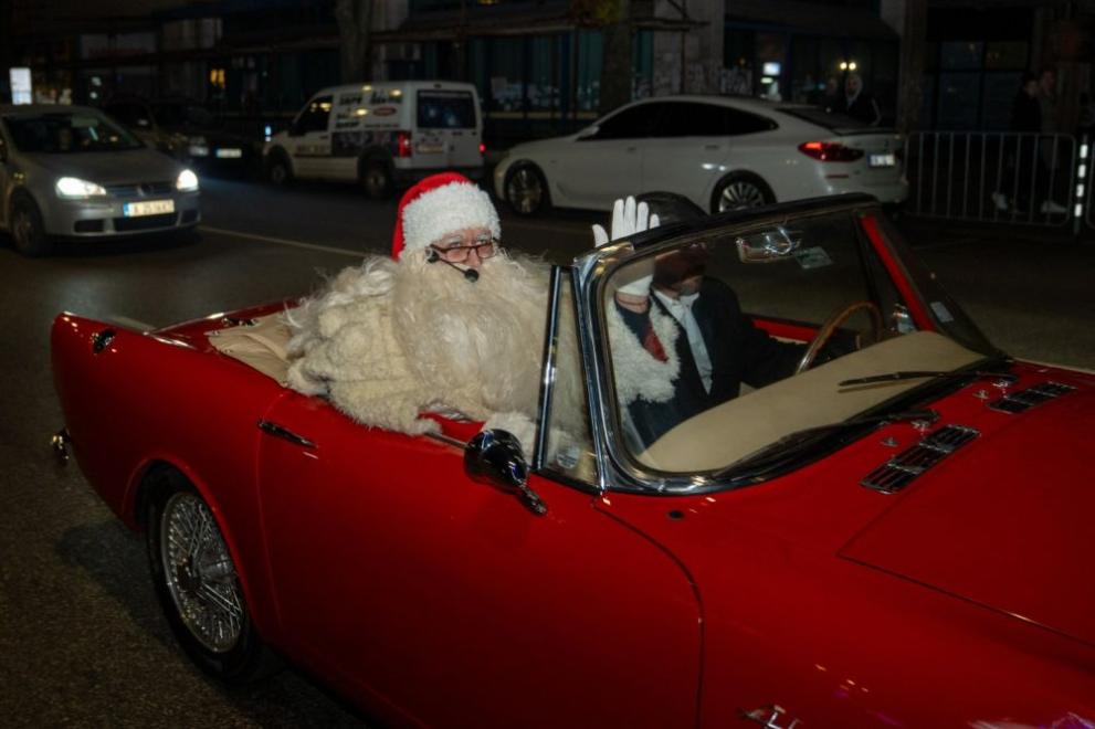 Добрият дъртак светна голямата елха благодарение на хилядите деца пристигнали за събитието, последвано от обилна заря . Дядо Коледа дойде с гръмък червен автомобил " Сънбийн Алпин " - колата на Джеймс Бонд