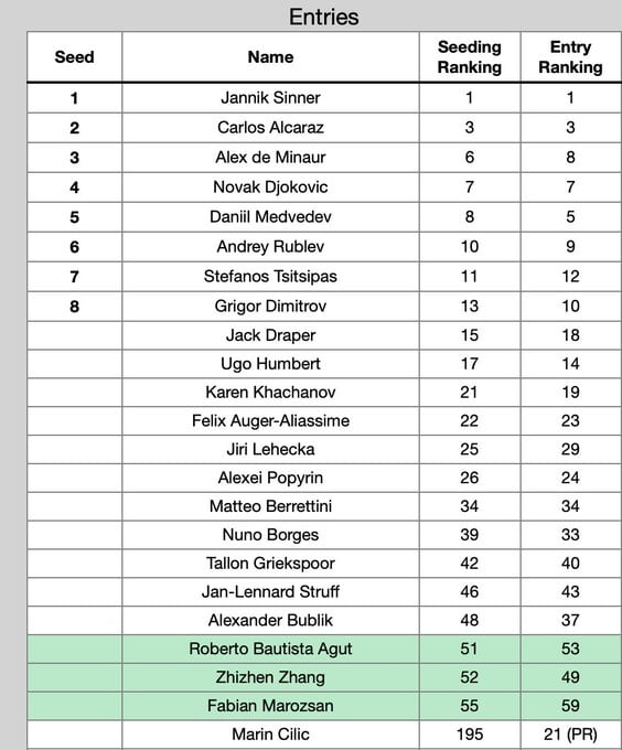 Марин Чилич, Жижен Жанг, Роберто Баутиста Агут, Фабиан Марожан, Александър Бублик, Ян-Ленард Щруф, Карен Хачанов, Феликс Оже-Алиасим, Иржи Лехечка, Уго Юмбер, Джак Дрейпър, Алексей Попирин, Нуно Боржеш, Матео Беретини, Талон Грийкспор и още 9 играчи с " уайлд кард " или минали през квалификациите.