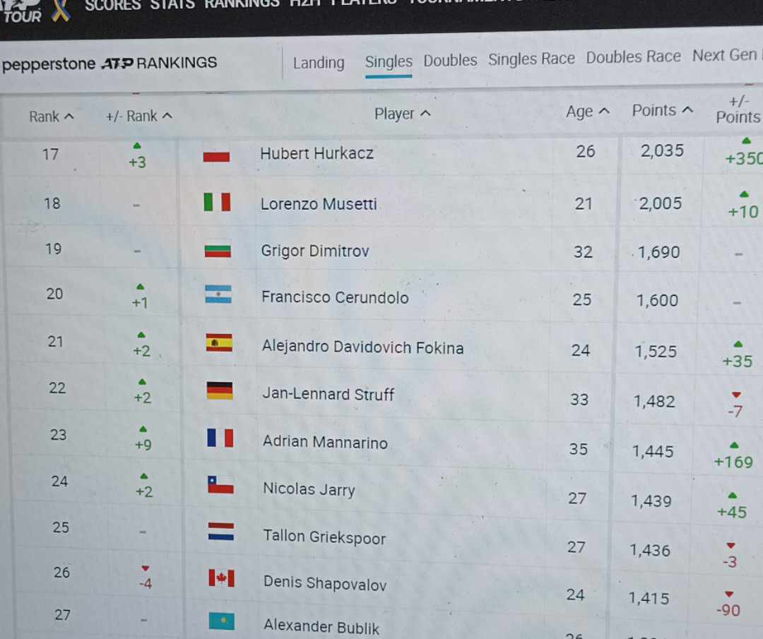Така Григор записа своята най-висока позиция от предишния август насам и има солидна преднина от 90 точки пред своя непосредствен преследвач, а точно Франсиско Серундоло. Неприятното е, че Димитров мъчно би могъл в скоро време да реализира нов напредък в ранглистата, тъй като е на цели 315 пункта зад Лоренцо Музети, който заема 18-ото място, само че не трябва да забравяме, че българинът доближи едвам до втория кръг на US Open през предходната година и има положителни шансове да прибави нови точки към актива си.