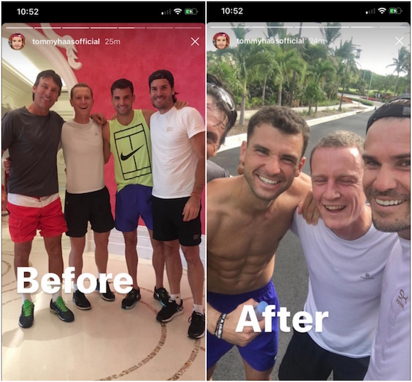 Освен че се забавлява добре и си почива след изтощителния сезон, Григор гледа и да не излиза от форма. Затова той не спести сили и даде всичко от себе си, с цел да победи своите противници. А с цел да ги “утеши” след загубата, той им предложи особено обслужване - сервира им минерална вода пред хотела “Гранд Хаят Баха Мар”.