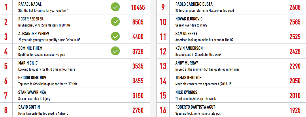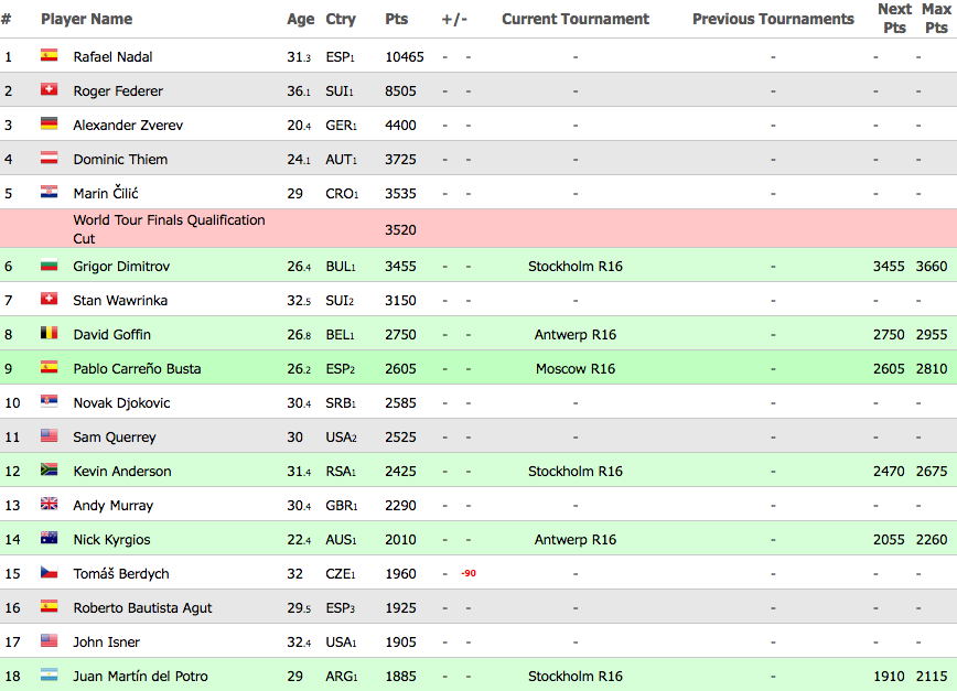 Четирима към този момент са сигурни за Финалите на АТР - Рафаел Надал, Роджър Федерер, Александър Зверев и Доминик Тийм. Очакванията са Чилич и Димитров да се причислят към тях скоро, а за последните две места до последно ще се води битка сред Давид Гофен (2750 точки), Пабло Кареньо-Буста (2605), Сам Куери (2525), Кевин Андерсън (2425), Томаш Бердих (2050, Ник Кирьос (2010) и други.