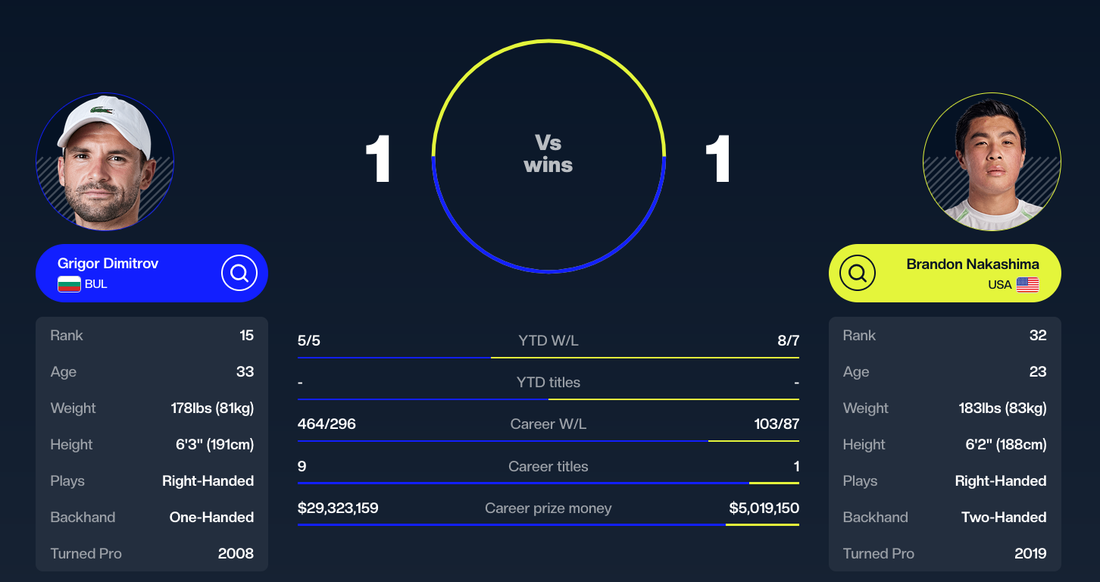 Григор Димитров и Брендън Накашима се познават добре, защото към този момент са играли два мача между тях. Балансът в тях е 1-1, тъй че идният дуел сигурно ще бъде завладяващ и с ненапълно непредсказуем излаз. Младият американец, който заема 32-ро място в международната класация, се намира в чудесна форма, а 33-годишният хасковлия има да си връща да 3-сетовата загуба от него при последната им среща на US Open - 7:6(5), 7:5, 6:3 за Накашима.