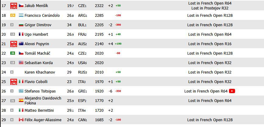 В момента Григор е 19-и в международната класация онлайн или две места по-надолу в сравнението с класирането му преди началото на борбите в Париж. Всички към него също към този момент отпаднаха. На процедура единствено един състезател може да го изпревари до края на " Ролан Гарос " и това е сензацията в шампионата Александър Бублик.
