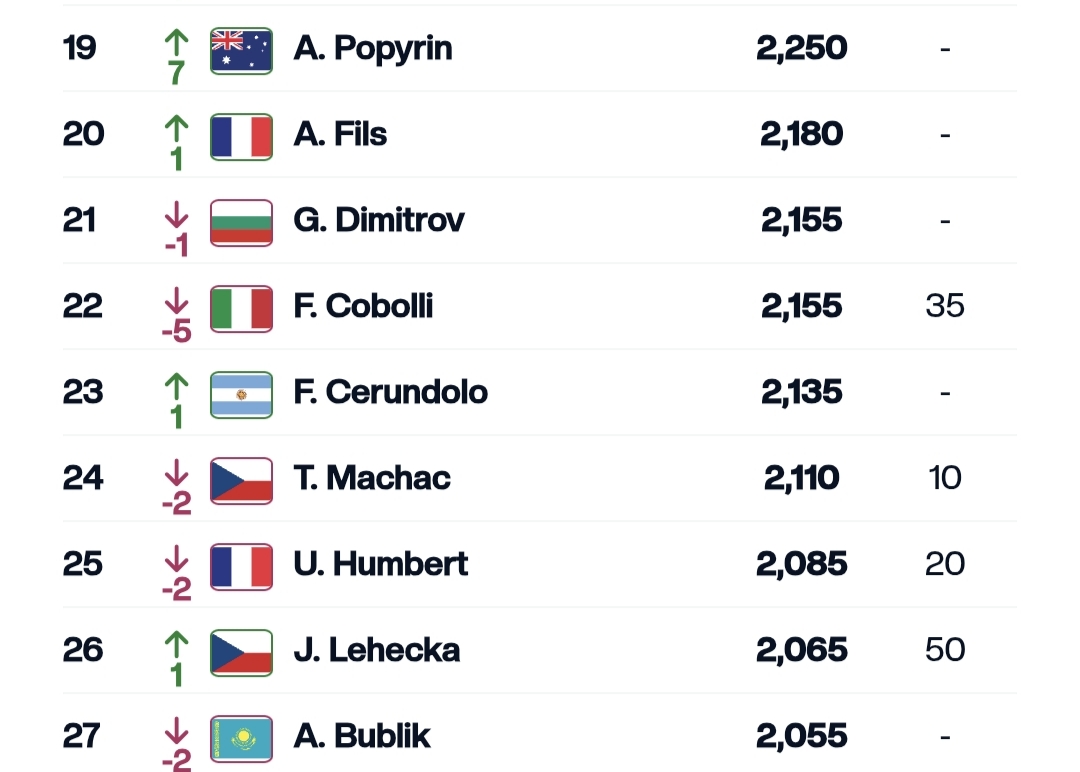 Българинът беше изпреварен от Артур Фис и към този момент заема 21-ва позиция в класацията, разполагайки с актив от 2155 пункта. Цели 6-има тенисисти обаче се намират на по-малко или на тъкмо 100 точки разстояние от нашия топ играч (Флавио Коболи, Франсиско Серундоло, Томаш Махач, Уго Юмбер, Иржи Лехечка и Александър Бублик) който има да пази цели 400 точки от миналогодишния си 1/4-финал в Ню Йорк и това значи, че Димитров съвсем несъмнено ще загуби мястото си измежду първите 30 в идните седмици.