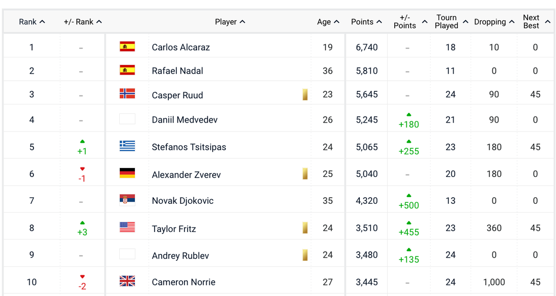 В топ 10 също има промени. Финалистът от Астана Стефанос Циципас измести Александър Зверев от петата позиция, а първенецът от Токио Тейлър Фриц дебютира измежду най-хубавите 10, откакто трофеят го изстреля с три места нагоре в ранглистата, до №8. В същото време Камерън Нори загуби две места и към този момент е 10-ти. Начело остава Карлос Алкарас с 6740 точки, следван от Рафаел Надал с 5810, Каспер Рууд с 5645 и Даниил Медведев с 5245 точки.