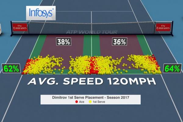 Средната скорост на първия сервис на Димитров е 193 км/ч, а предходната година бе 185 км/ч. По-важното за цялостния триумф на българина обаче се оказва особеното разпространение на топката при първо подаване.