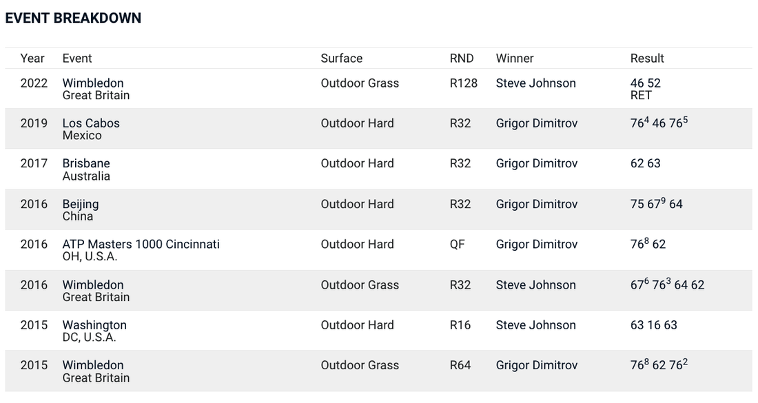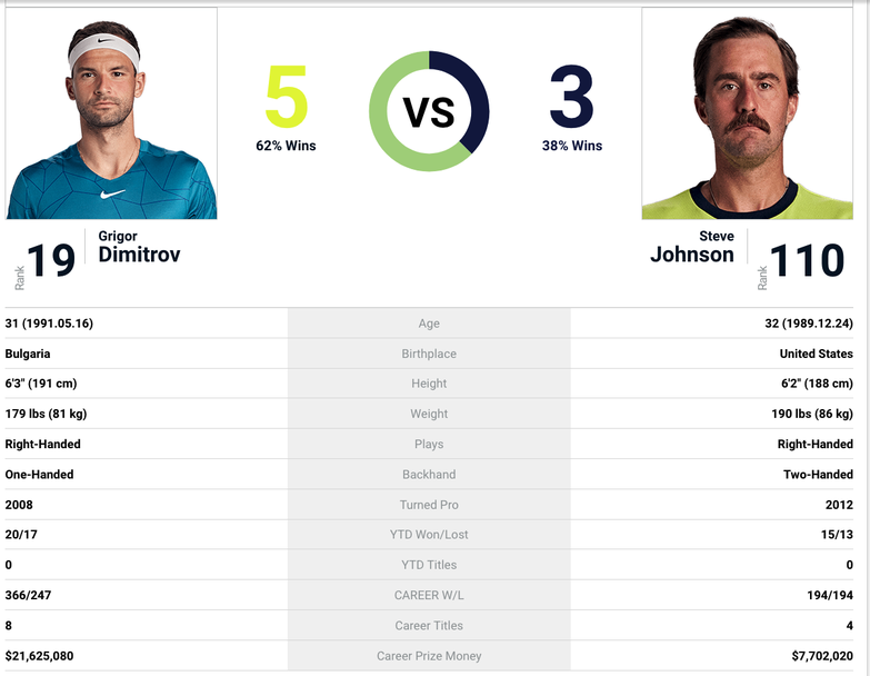 До момента Димитров и Джонсън са играли между тях осем пъти, като салдото е 5-3 в интерес на българина.