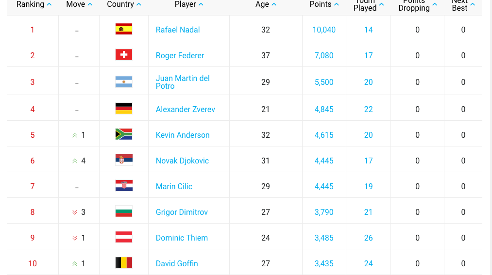 №1 остава Рафаел Надал с 10040 точки, следван от Роджър Федерер със 7080 и Хуан Мартин дел Потро с 550 точки. Четвърти е Александър Зверев с 4845, а на пета позиция се изкачи Кевин Андерсън с 4615. Шампионът от Синсинати Новак Джокович се изкачи с четири места и към този момент е шести с актив от 4445 точки.. Със същия брой точки е и Марин Чилич, до момента в който Доминик Тийм отстъпи до 9-ото място с 3485. Давид Гофен също направи крачка обратно и към този момент е №10 с 3435 точки.