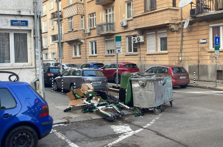 Кашони, едрогабаритни хартиени опаковки, остаряло детско краветче и друга боклук " красят " тротоара. Композицията допълват изпопадали електрически тротинетки, станали жертва на поредна вандалска демонстрация.