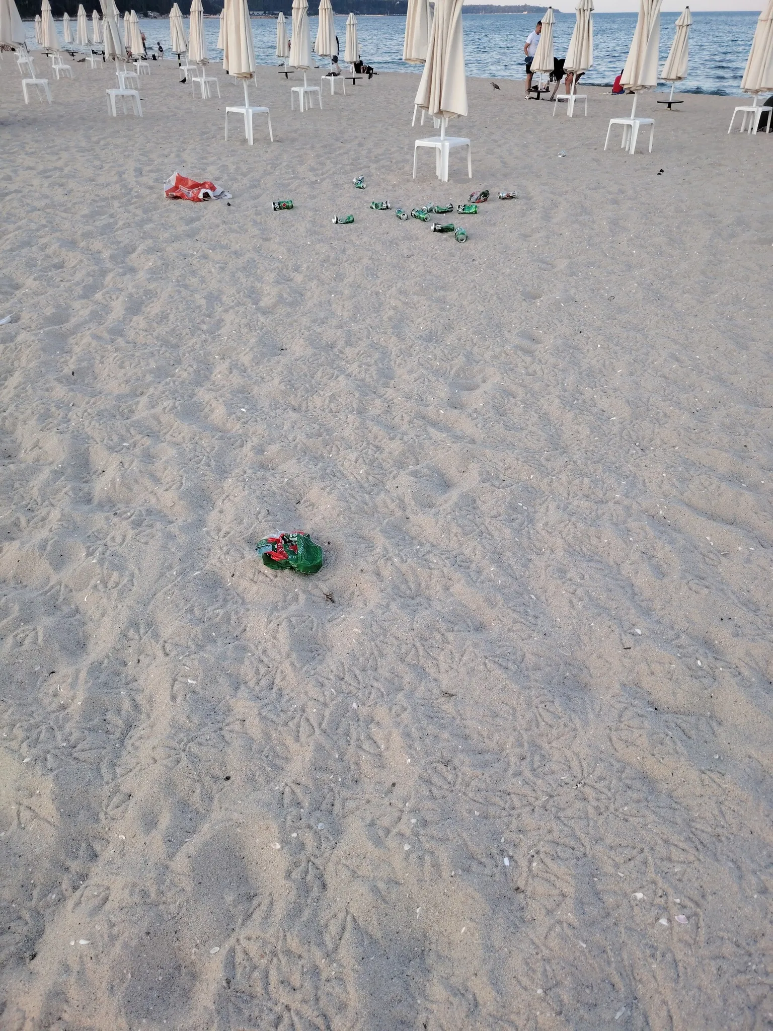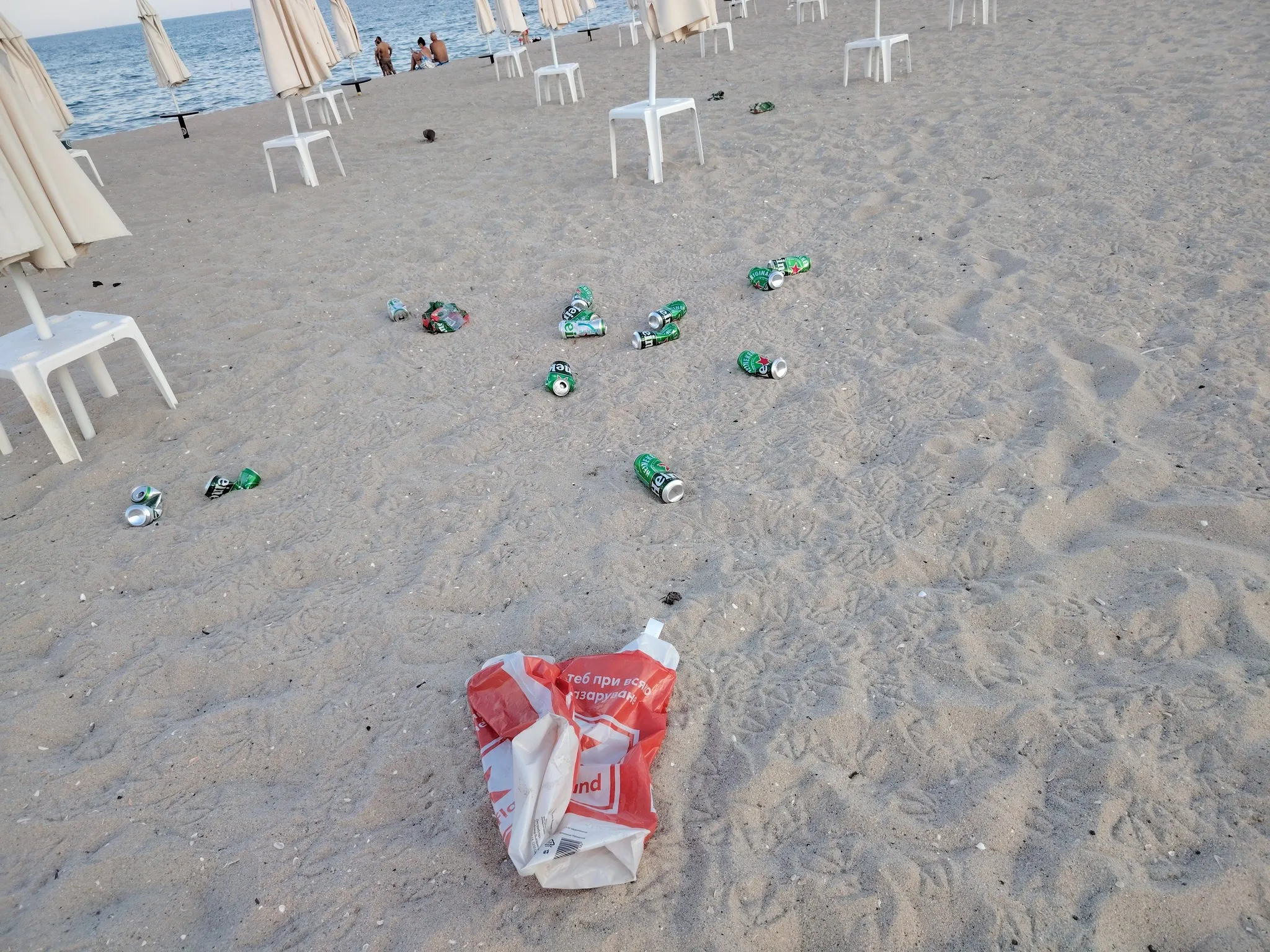 Пластмасовите и железни боклуци се търкалят сред чадърите и шезлонгите, в явен контрастност с другояче красивата плажна линия. Нито един от посетителите, оставили след себе си това безсрамие, не е направил изпитание да прибере или изхвърли боклука. Вместо това мизерията остава за сметка на идващите туристи, напразно и най-много – на природата.