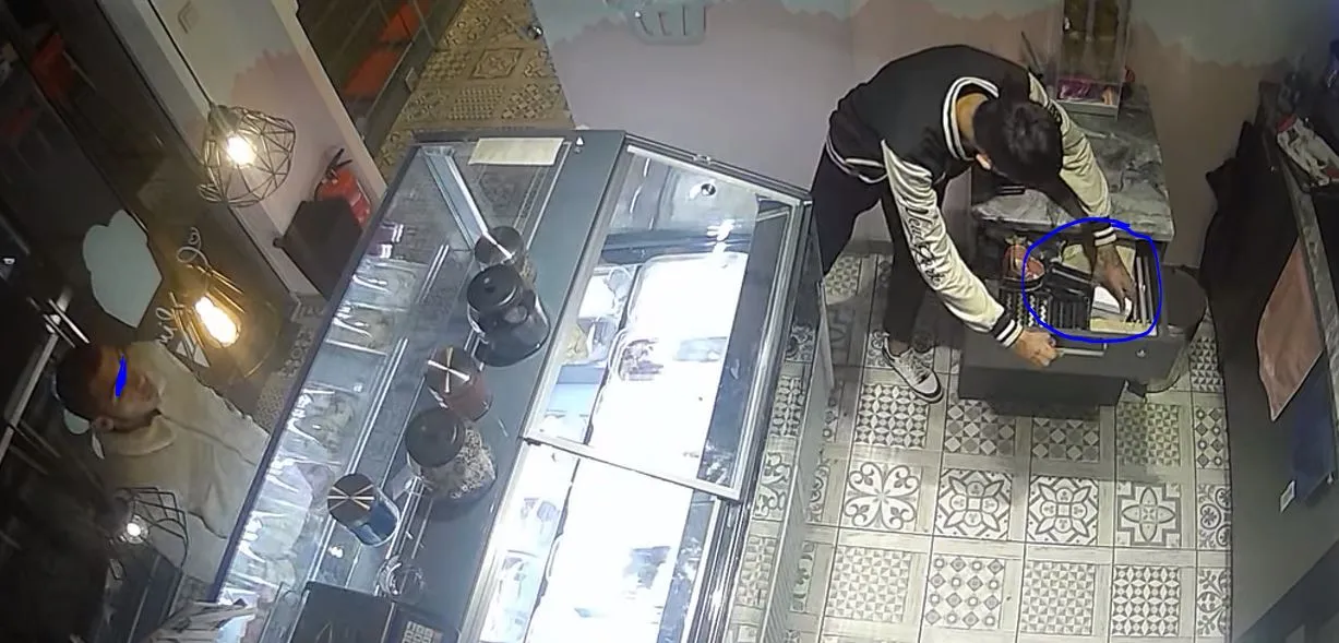 Те се възползват от обстоятелството, че на касата в този миг няма никого и се насочват към нея. Единият следи за появяването на чиновници, а другият отваря шкафа, където се намира касата. Ръката му подминава монетника и отваря кутия, откъдето взима движимост, наподобяваща на банкнота.