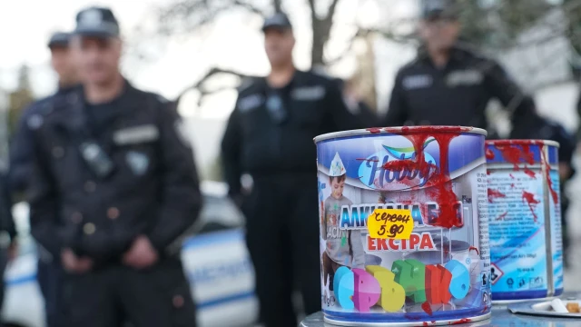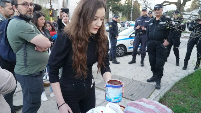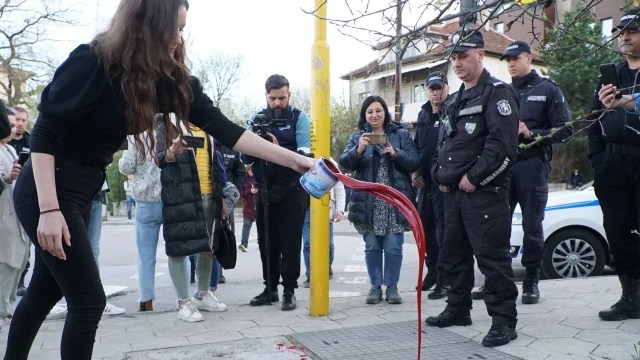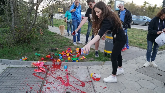 Група жители се събраха пред посолството на Русия у нас и изляха алена багра и разпръснаха детски играчки.