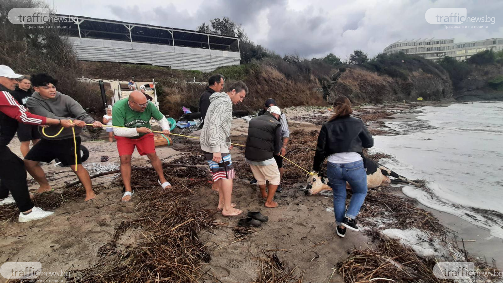 Хората са основали организация, с цел да изтеглят кравата от бурното море. С помощта на въжета са превързали рогата ѝ, с цел да я издърпат на брега. Скоро по-късно положението на животното се е подобрило, споделят курортистите пред TrafficNews .