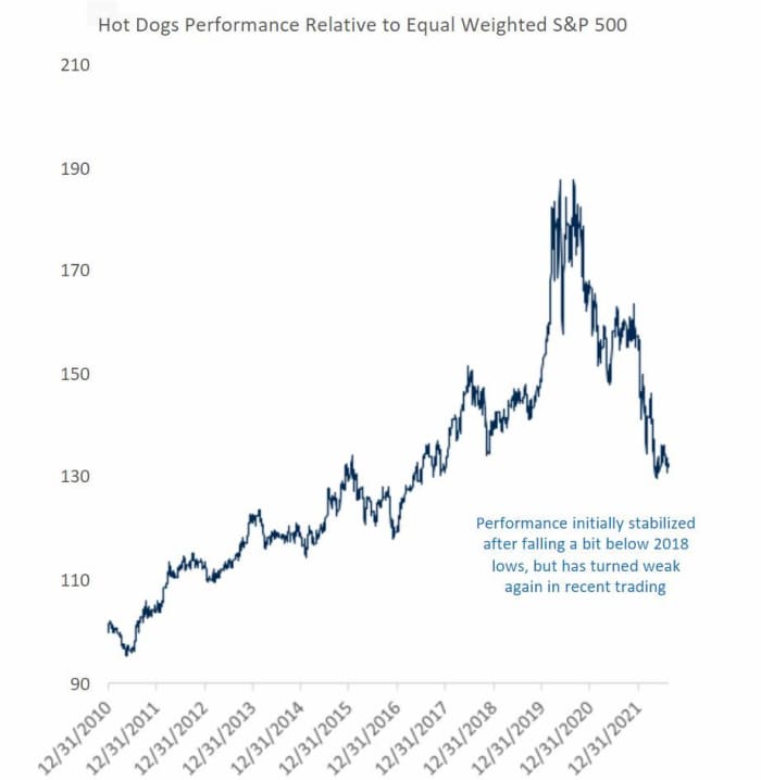 Група от най-популярните акции, притежавани от най-големите хедж фондове в света, още веднъж стартират да се показват по-слабо от по-широкия пазар. Според екип от анализатори на RBC Capital Markets, това е знак, че американските акции може да се насочат към нов спад.От няколко години екип от финансови анализатори, управителен от Лори Калвасина, началник на тактиката за акции на RBC в Съединени американски щати, наблюдава кошница от това, което назовава „ хот-дог на хедж фондовете “ – най-популярните акции в S&P 500 притежавани от 300 от най-големите хедж фондове в света. Анализаторите актуализират кошницата четири пъти в годината, откакто хедж фондовете разгласяват разбивката на своите акции в края на тримесечието.Откакто сътвори кошницата, екипът видя модел: когато „ хот-договете на хедж фондовете “ стартират да се показват по-слабо от еднообразно претеглена версия на S&P 500, това постоянно е знак, че се чака необятно ликвидация на акциите.Това се случи през 2018 година, когато кошницата стартира да се показва по-слабо към месец преди разпродажбата през четвъртото тримесечие на същата година. И след къс интервал на стабилизация през това лято, „ хот-договете “ още веднъж се представяха по-слабо.Индикаторът е работил и в другата посока: Калвасина и нейният екип обясниха, че превъзходството на „ хотдога “ през април и май ги прави оптимистични, че може да се доближава дъно в кратковременен проект.Графиката по-долу изобразява представянето на кошницата на хедж фондовете за хот-дог по отношение на равнопретегления показател S&P 500.