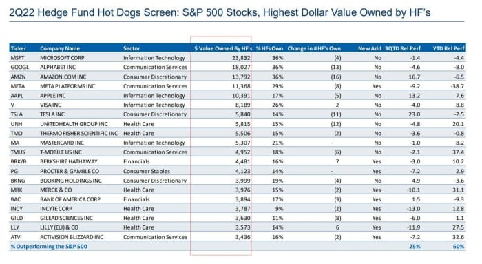 Източник: RBCПрез последните няколко седмици кошницата още веднъж стартира да се показва едва.„ Слабостта на тази кошница до момента през 3Q22, когато единствено 25% от имената в този лист са по-добри от S&P 500, е нещо, което следим от близко, защото може да алармира, че акциите като цяло са подготвени да преживеят нов припадък на неустойчивост през идващите месеци “, написа екипът.Ето разбивка на съставните елементи на кошницата, класирани по общата стойност в долари, притежавана от инструмента за следене на 300 фондове от RBC.