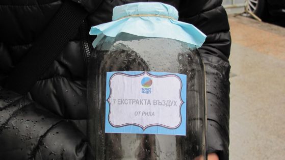 Носещи противогаз и маски, членове на самодейността подканиха минувачите да си вземат буркан с чист въздух, като подчертаха, че скоро няма да има.