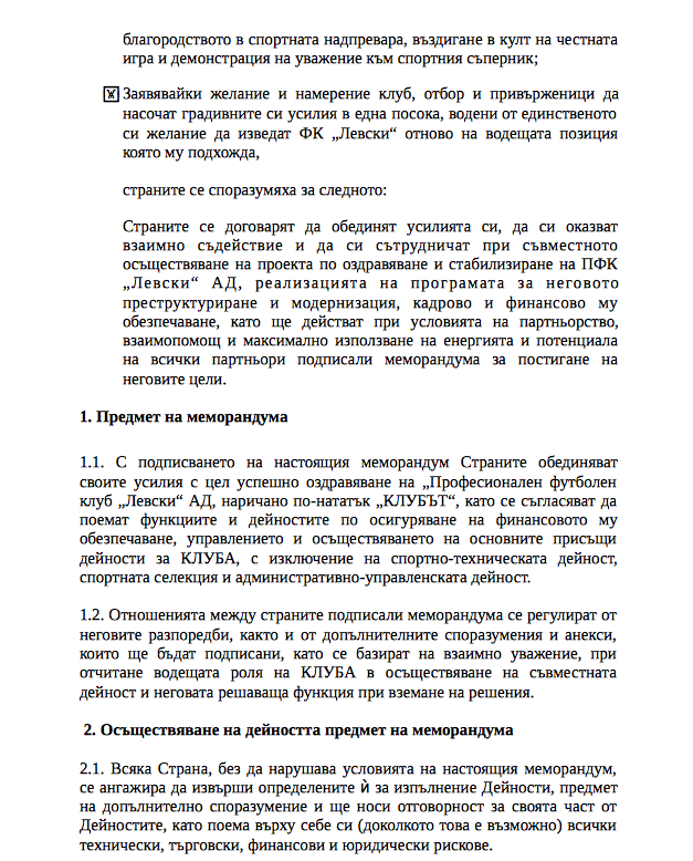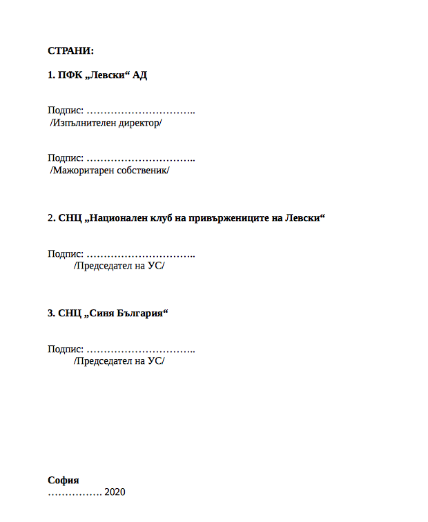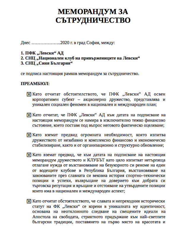 Групировката " Ултрас Левски " разгласи, че смъртната присъда на " синия " клуб е написана и уточни Националния клуб на последователите и Тръст " Синя България " за " палачи ". Фенската организация засяга меморандум, под който ще се подпишат мажоритарният притежател на Левски Наско Сираков, изпълнителният шеф на клуба Павел Колев и ръководителите на НКП и ТСБ. Ето какво съставлява въпросният меморандум, който нажежи " синя " България:
