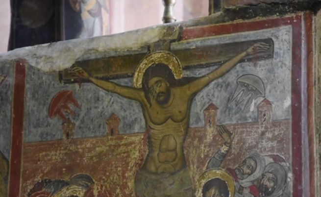 Грузинска фреска от 17-и век на разпъването на Исус Христос провокира вниманието на търсачите на НЛО.