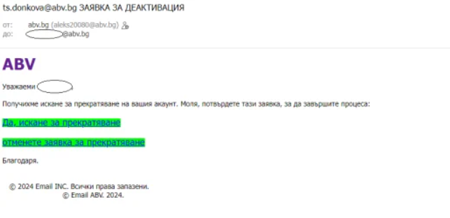 Хакери се пробват да излъгват консуматори на Abv.bg с подправени имейли за деактивация на акаунт. Електронни пощи са залети с писма, в които се твърди, че е получено искане за преустановяване на акаунта на въпросния консуматор.